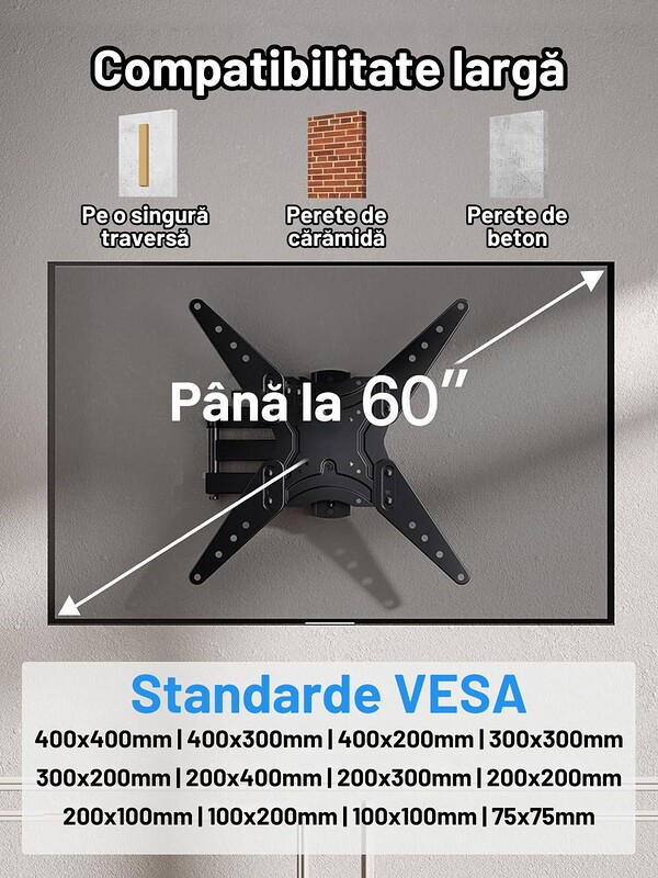 Suport TV de Perete, Premium, Montare pe Perete, Reglabil, Rotire / Extindere / Inclinare / Pivotare, Universal pentru Televizoare 26 – 60 Inch (66 – 152 cm), compatibil VESA 75×75 – 400×400, Max 32 kg, Instalare Usoara, Negru
