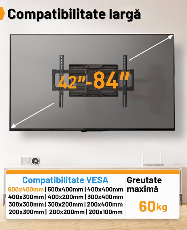 Suport TV de Perete, Premium, Montare pe Perete, Reglabil, Rotire / Extindere / Inclinare / Pivotare, Universal pentru Televizoare 42 – 84 Inch (106 – 213 cm), compatibil VESA 200×100 – 600×400, Max 60 kg, Instalare Usoara, Negru