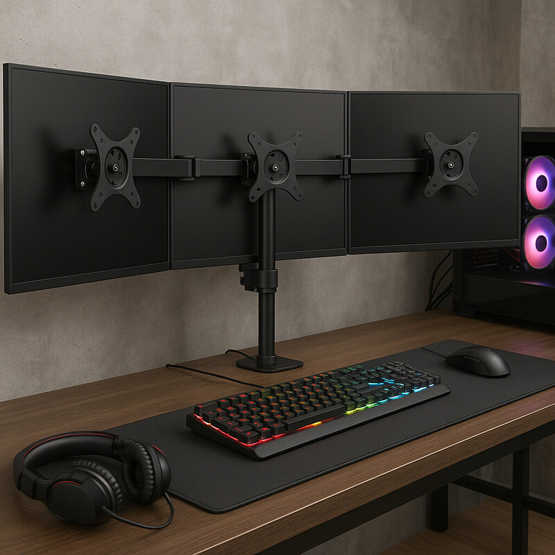 Suport 3 Monitoare Premium pentru Birou 17-32″ inch, Arc pe Gaz, pentru Productivitate, Multitasking, Munca, Gaming, Organizator Cabluri, Instalare Usoara, Ergonomic, VESA 75×75 / 100×100, Pana la 8 kg per brat, Prindere cu Clema/Surub, Negru