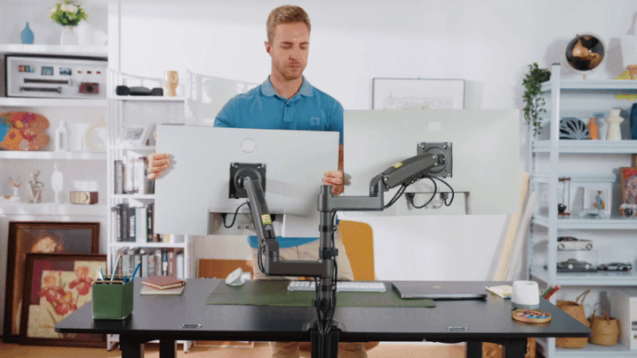 Suport pentru 2 Monitoare Premium 13-32″ inch, Arc pe Gaz, pentru Productivitate, Munca, Gaming, Organizator Cabluri, Instalare Usoara, Ergonomic, VESA 75×75 / 100×100, Pana la 9 kg per brat, Prindere cu Clema / Surub, pentru Birou, Negru