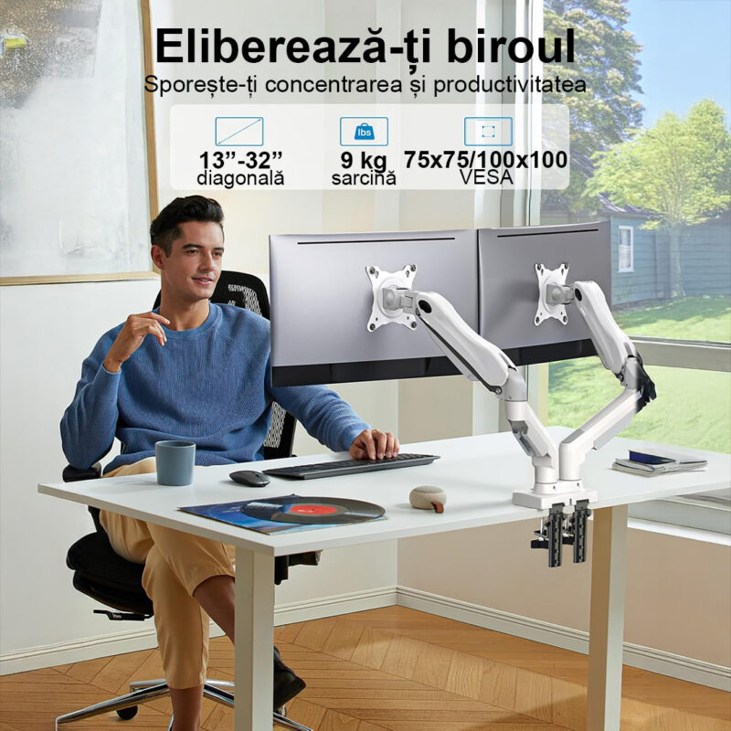 Suport pentru 2 Monitoare Premium 13-32″ inch, Arc pe Gaz, pentru Productivitate, Munca, Gaming, Organizator Cabluri, Instalare Usoara, Ergonomic, VESA 75×75 / 100×100, Pana la 9 kg per brat, Prindere cu Clema / Surub, pentru Birou, Alb