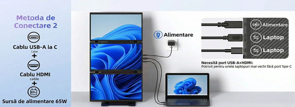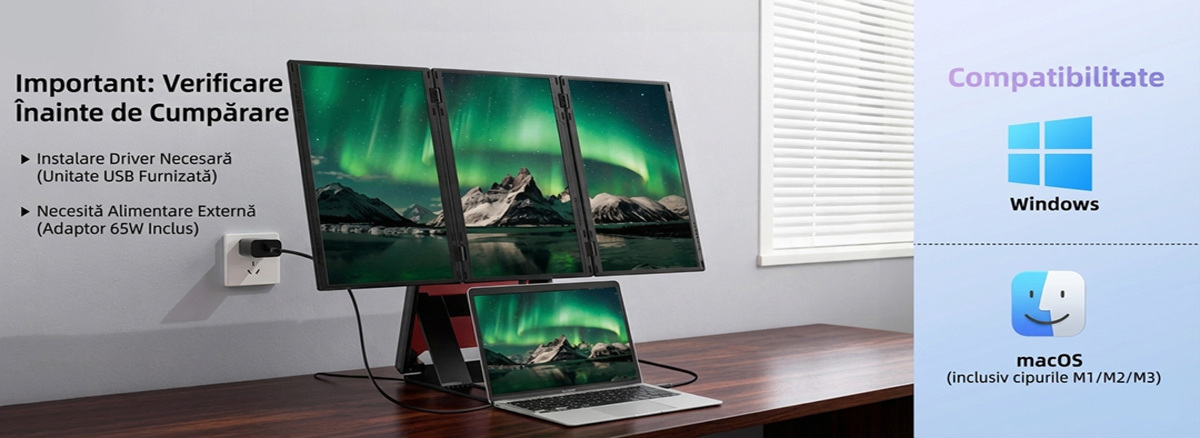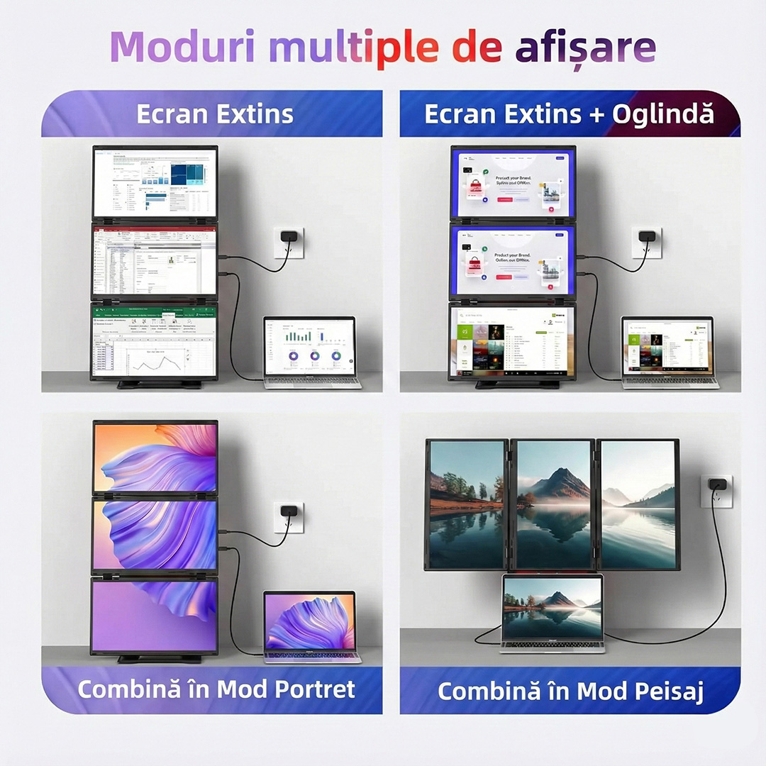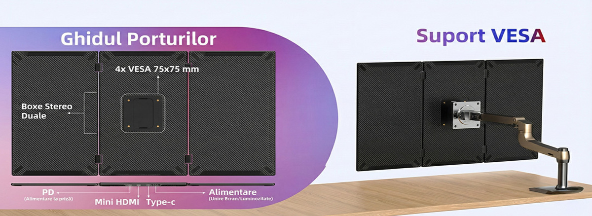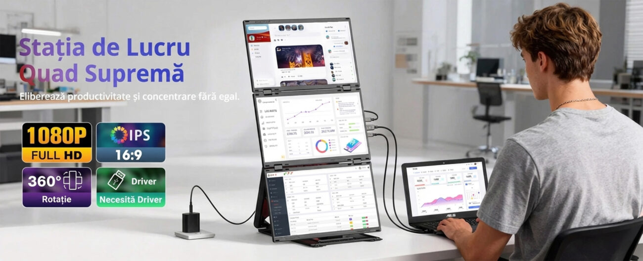 Acest sistem inovator transforma instantaneu un singur laptop intr-un spatiu de lucru triplu, oferind o suprafata vizuala generoasa de pana la 30 de inch combinati. Este solutia ideala pentru profesionistii care calatoresc des, permitand multitasking eficient si gestionarea simultana a mai multor aplicatii fara a schimba ferestrele.