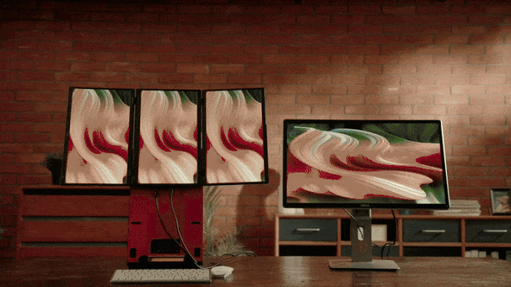 Datorita balamalelor flexibile si designului modular, poti configura ecranele in mod peisaj, portret sau suprapuse pe verticala pentru a se potrivi perfect fluxului tau de lucru. Functia de rotire la 360 de grade faciliteaza prezentarile catre colegi sau clienti aflati in aceeasi incapere, direct de pe laptopul tau.