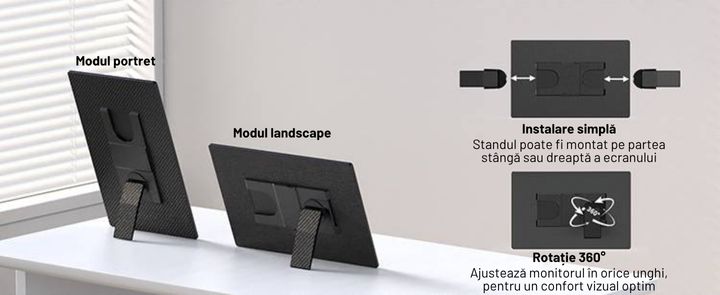 Suportul detasabil, cu rotatie de 360°, iti permite sa ajustezi ecranul in orice unghi. Poti comuta fara efort intre modul landscape (orizontal) si cel portrait (vertical), perfect pentru programare, citit documente lungi, editare foto-video sau gaming. Designul sau ultra-subtire si usor il face partenerul ideal pentru calatorii si munca la distanta.