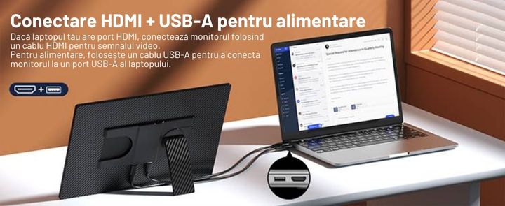 Nu mai trebuie sa-ti faci griji cu privire la compatibilitate. Monitorul se conecteaza usor la o gama larga de dispozitive. Ai la dispozitie multiple optiuni: un singur cablu Type-C (cu functii complete), sau o combinatie de cablu HDMI si alimentare prin USB-C sau adaptor. Indiferent de device-ul tau, conectarea este intuitiva si rapida.
