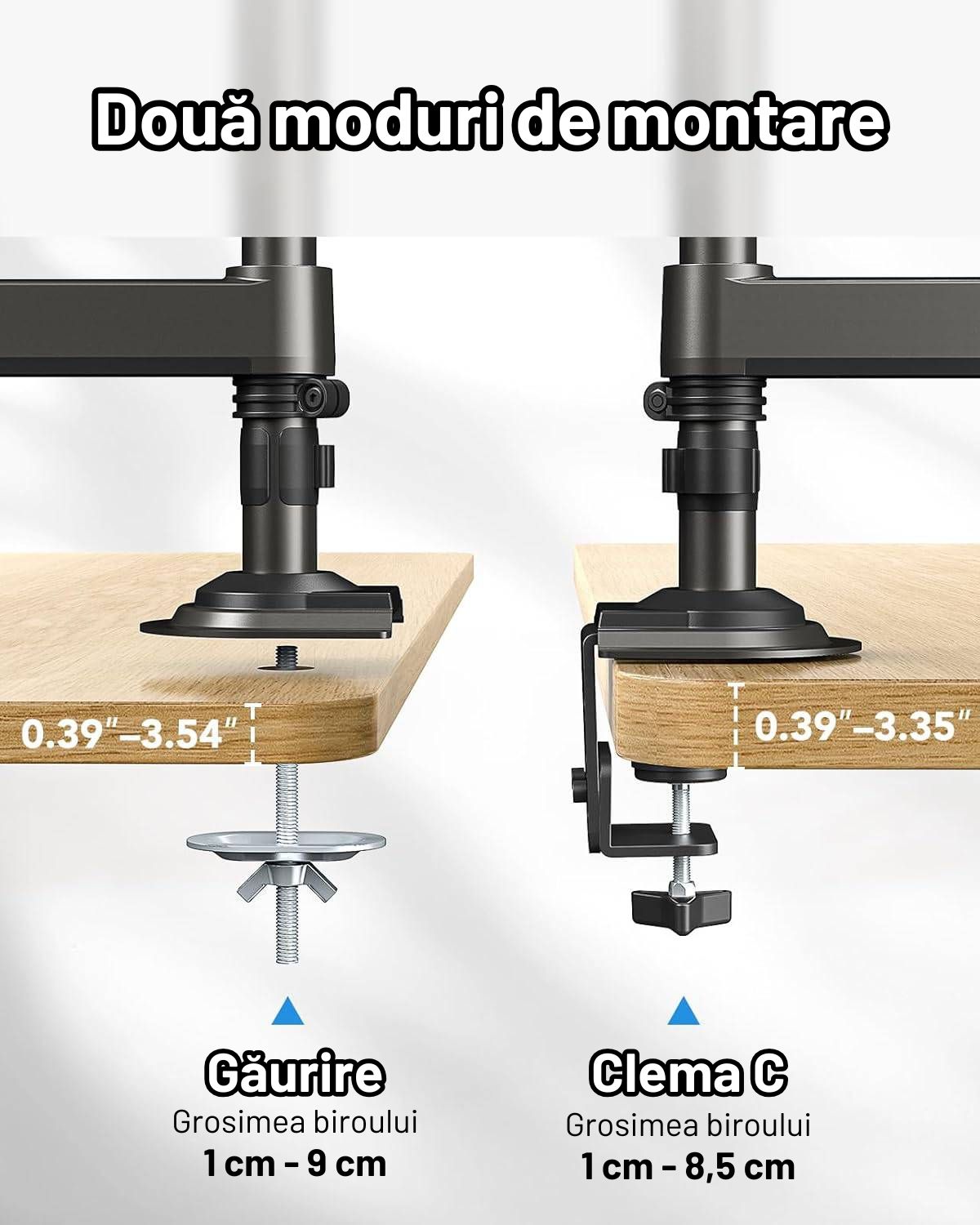 Instalarea se realizează ușor pe orice birou standard. Poți alege montarea cu clemă, fără a deteriora suprafața biroului, sau prinderea cu șurub pentru o fixare permanentă și mai solidă.