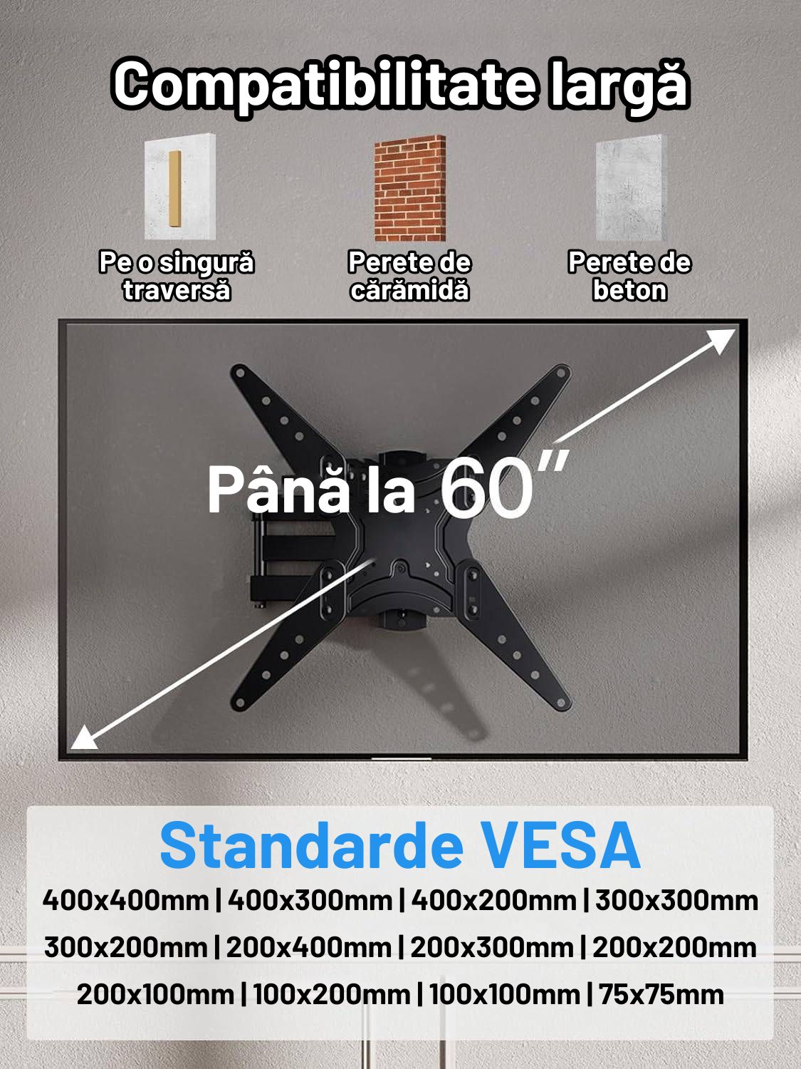 Indiferent de marca sau modelul televizorului tau cu ecran plat intre 26 si 60 de inch si cu standard VESA de pana la 400x400mm, acest suport tv de perete 26–60 inch este alegerea perfecta. Versatilitatea sa iti permite sa il folosesti cu o gama larga de televizoare, facandu-l un upgrade inteligent si adaptabil pentru orice locuinta.
