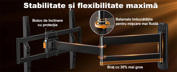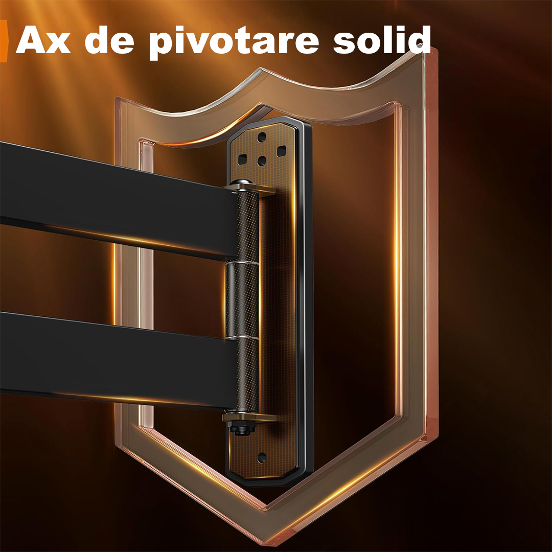 Siguranta televizorului tau este prioritatea noastra. Suportul este certificat si testat pentru a sustine in siguranta televizoare de pana la 45 kg, chiar si la extensie maxima. Balamalele solide si bratul cu 30% mai gros asigura stabilitate si o miscare fluida.