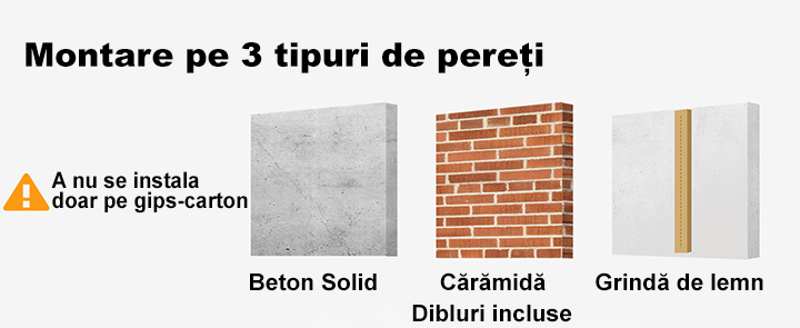 Tipuri de pereti compatibili: Beton, caramida, grinzi de lemn