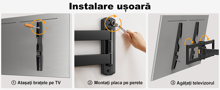 Cand nu este utilizat, suportul se poate retrage compact la perete, oferind un aspect curat si modern livingului tau. Montarea la inaltime tine televizorul in afara razei de actiune a copiilor si a animalelor de companie, sporind siguranta in locuinta.